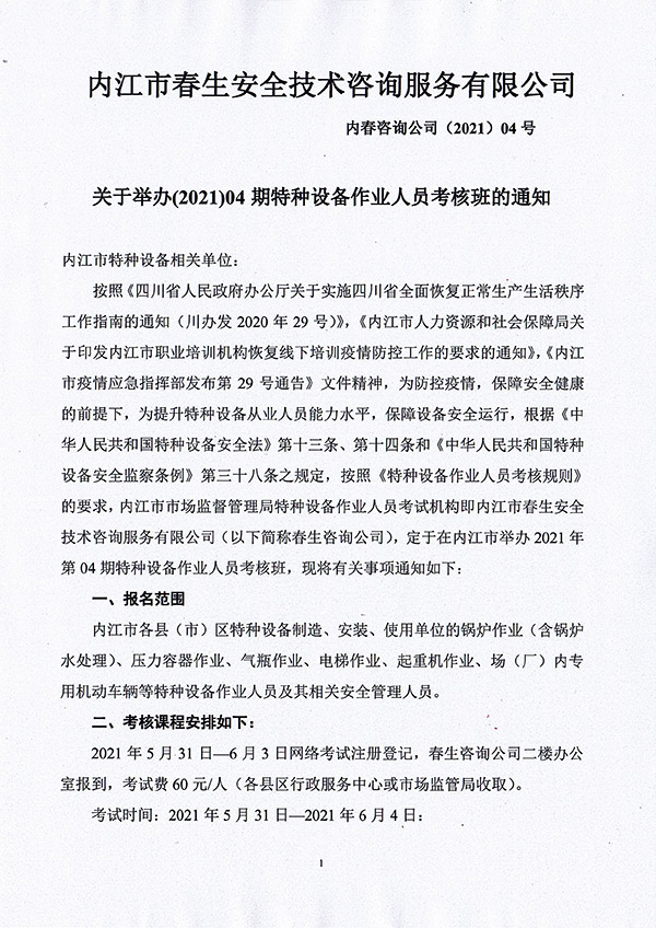 2021年春生公司04期特種設(shè)備作業(yè)人員考核班通知