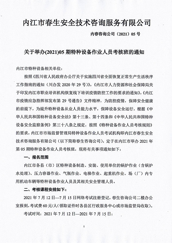 2021年春生公司05期特種設備作業(yè)人員考核班通知