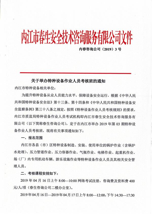 2019年第三期特種設(shè)備作業(yè)人員考核培訓班的通知