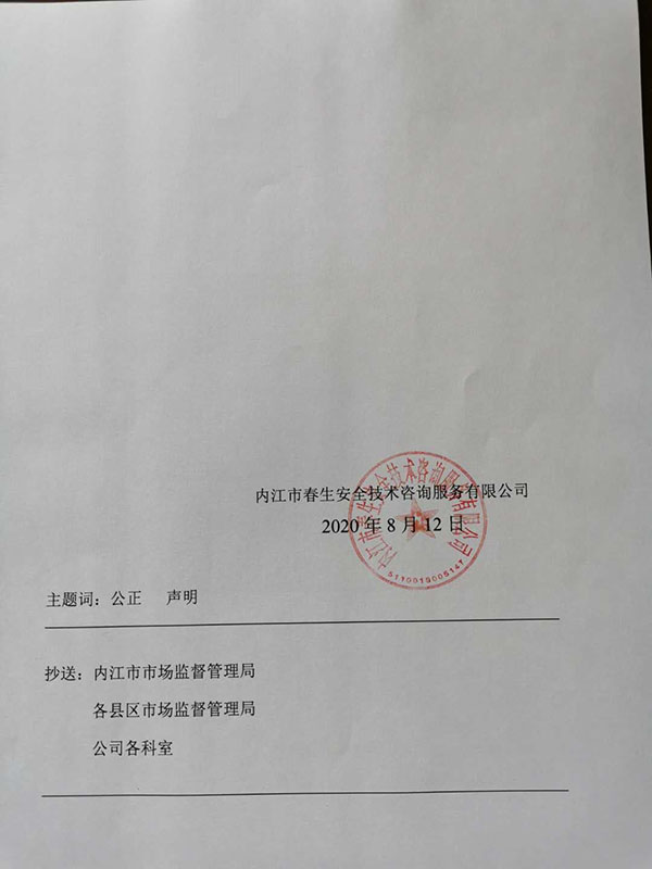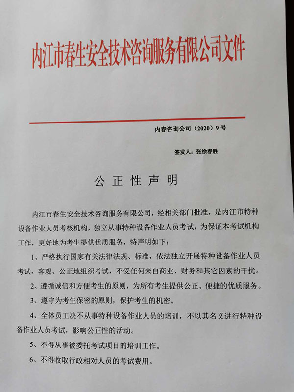 內(nèi)江春生安全技術(shù)咨詢服務(wù)有限公司2020年公正性聲明